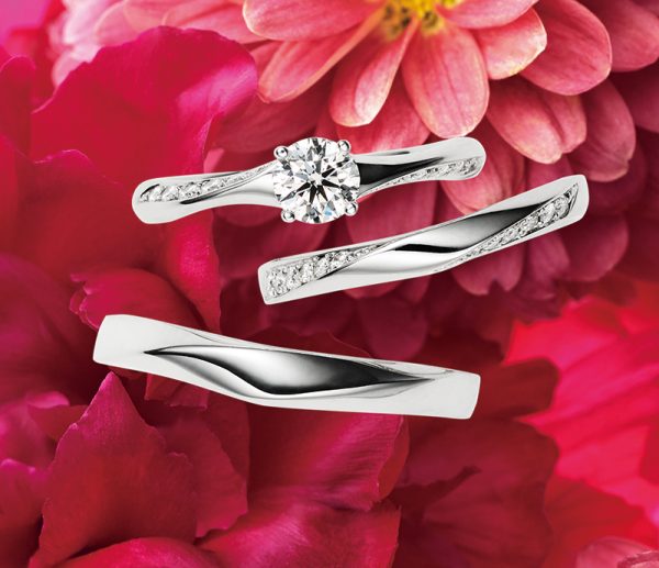 スイートピーの花言葉は、二人の門出・永遠の喜びです。軽やかに風にそよぐ姿は繊細で美しい。ともに寄り添い歩む2人をイメージしてデザインされたセットリングです。
