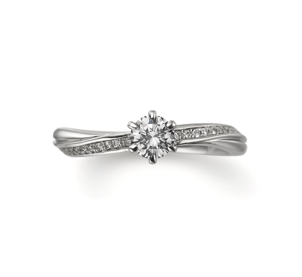 婚約指輪は、立て爪一粒ダイヤのサイドに可愛らしく2石のダイヤモンドが対象に並んでいます。捻りのある腕のラインがリボンの様で可愛いデザインです。