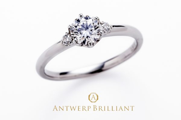 両サイドにダイヤモンドが並んだこちらのシンプルデザインは、ANTWERP BRILLIANTの婚約指輪(エンゲージリング)で”asterism” three stone diamond ringです。