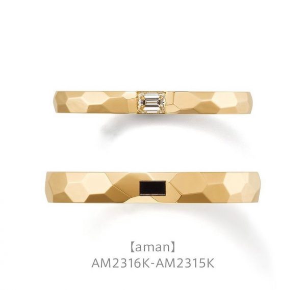AM-2316/AM-2315(aman collection )は、繊細なカットハンマーが放つ艶やかな光とエメラルドカットダイヤの透明な輝きを楽しめるオレッキオならではの結婚指輪。