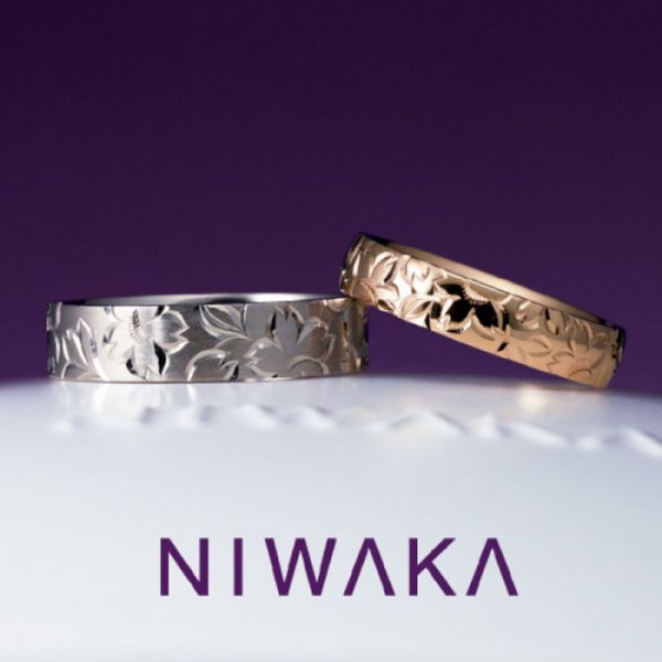 最後にご紹介したいのは、NIWAKAにわかの花匠の彫です。いにしえより日本人が育んだ、花鳥風月の美意識。今日まで受け継がれた名工の技。 和彫りの煌めきは、花の可憐なひとひらであり、様々に光を映す面はうつろう時を感じさせる、そんな美しい彫りの結婚指輪です。 かつて刀の鍔(つば)を彩ったその技は、京の伝統と共に四季の息吹を呼び覚ます。