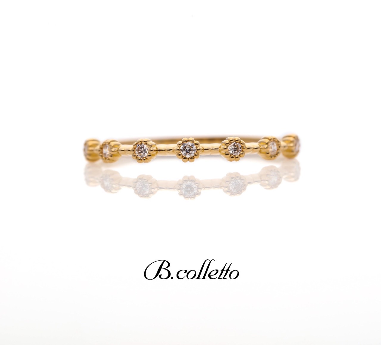 もう一つダイヤモンドの留め方に”レール留め”があります。リングに渕があり、埋め込まれたような留め方なので、引っかかりがなく普段から身に着けやすいエタニティリングです。