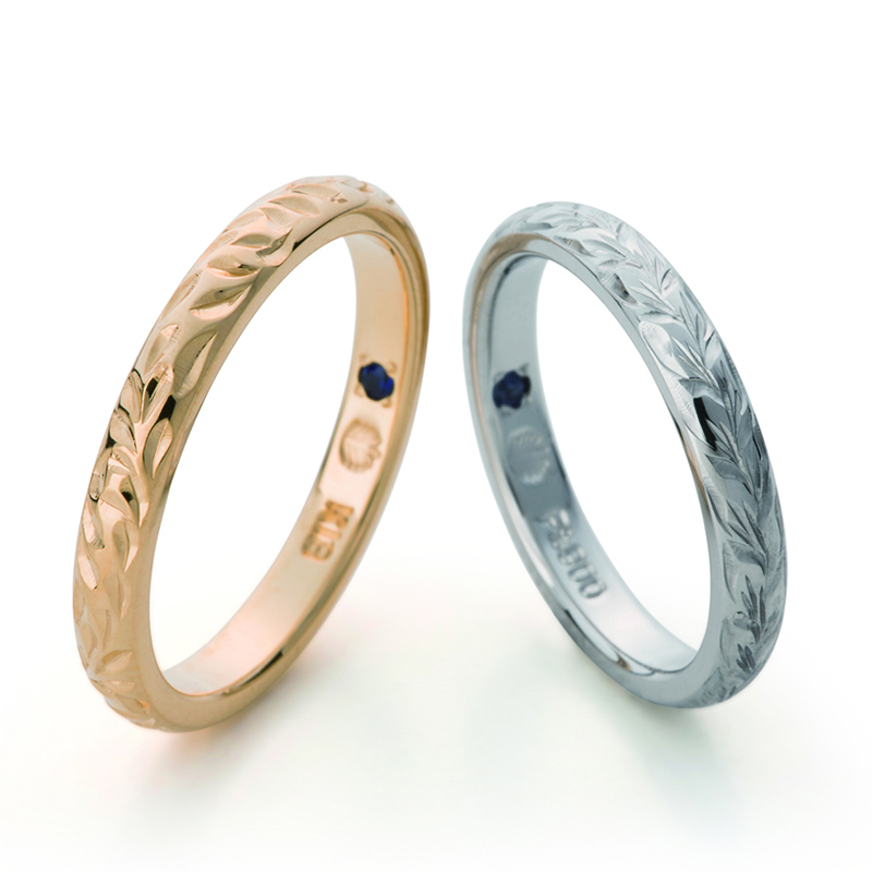 “その美しい花は 運命の証”という詩がついており、女性デザインは花びらのようなアシンメトリー曲線、男性デザインは、艶消しの中にラインで花びらを彫りこんでいます。