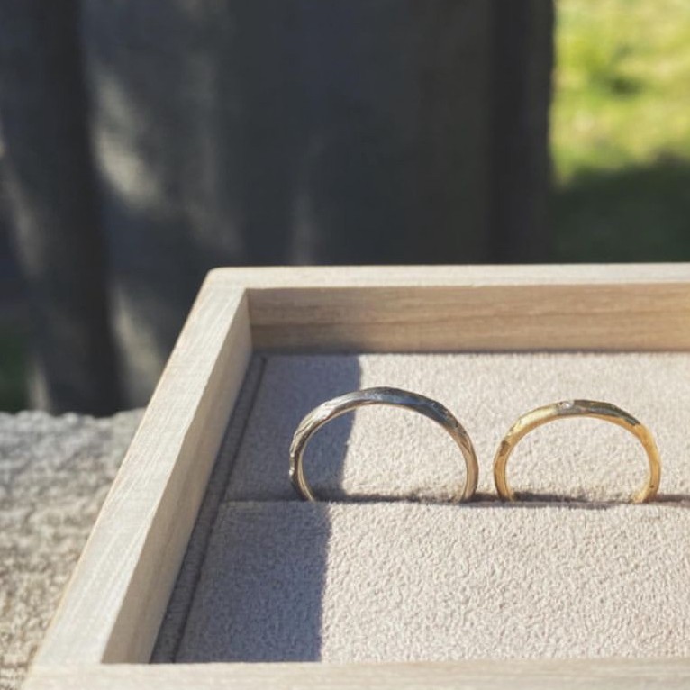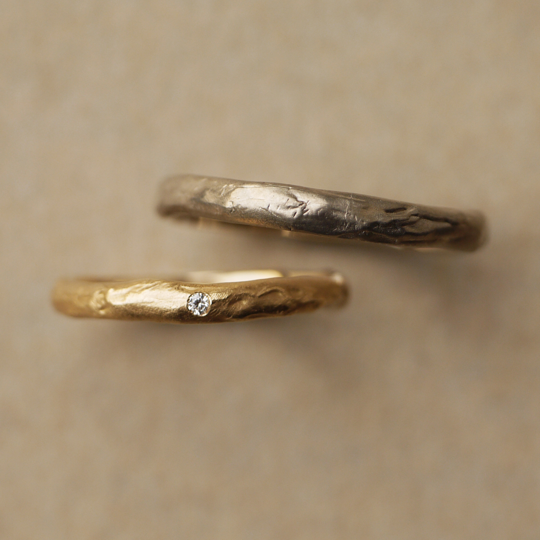 最近、多くのカップルが一般的なシンプルな光沢仕上げの他に、ハンマー仕上げの結婚指輪に魅了されています。ハンマー仕上げの指輪は独自の風合いや魅力を持っており、他の人と違った雰囲気を味わいたいカップルやオシャレ感を求めるカップルに人気があります。