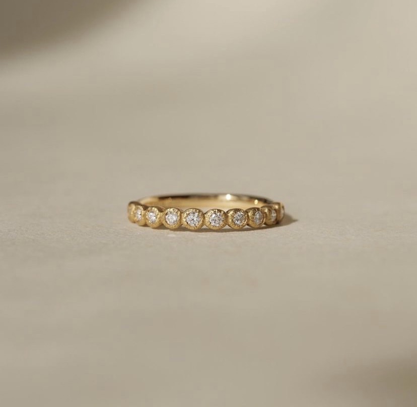 手作りのぬくもりを感じさせて、ほっこりとした、幸せであたたかい印象のハーフエタニティリングです。結婚指輪としても、婚約指輪としても、また、10ピースのダイヤモンドなので、ご結婚10周年の記念ジュエリーとしてもとても人気のBloomです。