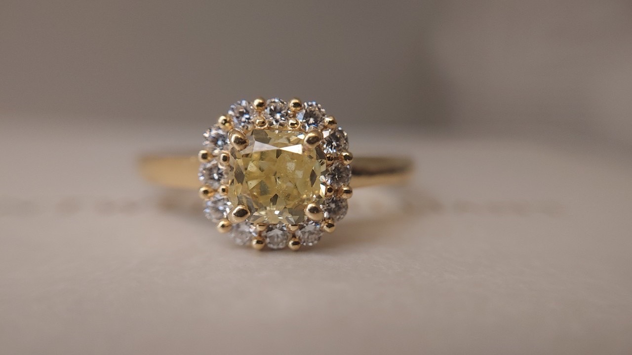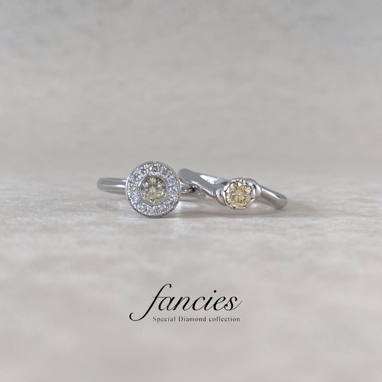 こちらの婚約指輪は、FLY(ファンシーライトイエロー)カラーダイヤモンドがより引き立つようにしたヘイローデザインです。メインのイエローダイヤモンドは、揺れるようにセッティングされているので、うるうるっと輝きとてもかわいいです。