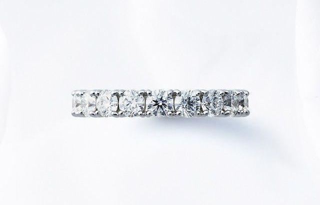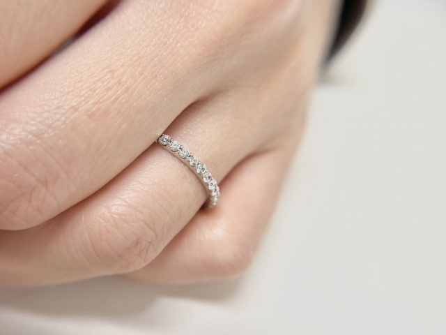 フルエタニティリングは、華やかでゴージャスな印象を与えてくれます。全周ダイヤセッティングなのでリングが回っても気にならず、傷が目立たないこともうれしいポイントです。ただし、フルエタニティリングは、サイズ直しがききにくいので、サイズ選びが重要です。