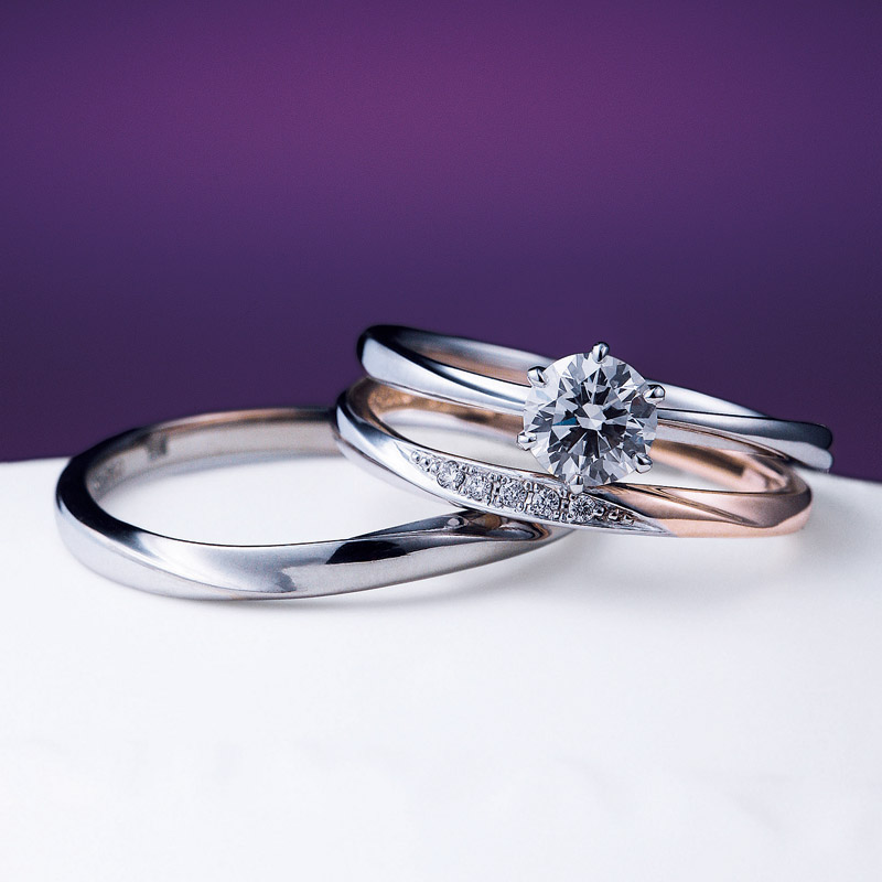 程よい存在感と独特なラインが特徴で、メレダイアモンドが上品な華やかさを演出してくれます。