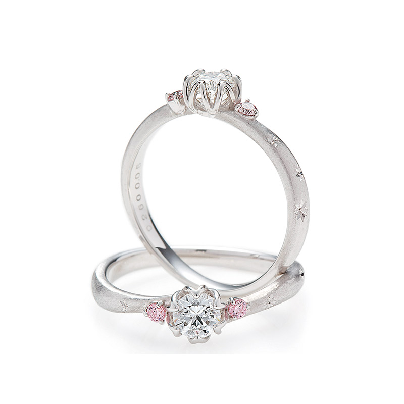 ウェディングリングの細タイプのデザインは、ひとひらの花びらをメレダイアモンドで表現し、太タイプのデザインは、側面にまで及ぶ有機的なラインで、花を支える桜の幹を表現しています。