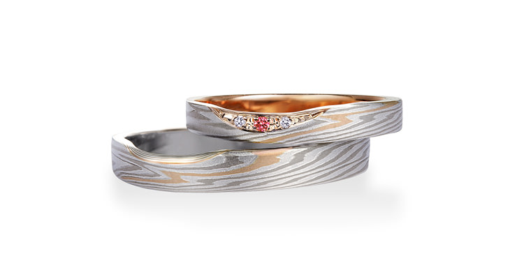 この杢目金の独自技法に、カラーダイヤモンドを組み合わせることで、他にはないオリジナリティ溢れる結婚指輪を作り出しています。