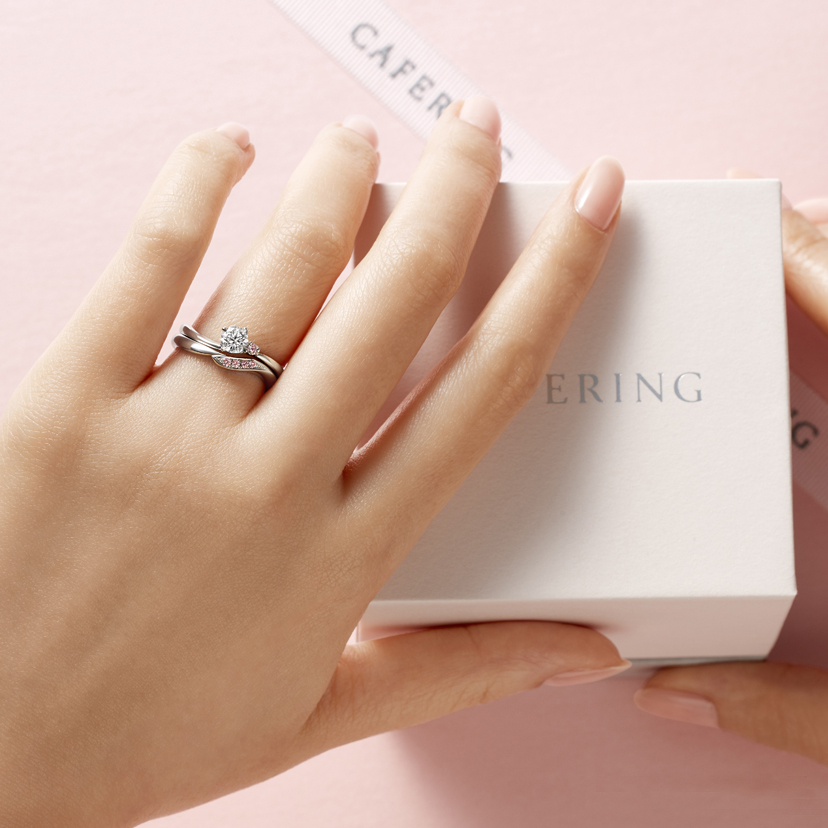 全体的に落ち着いた大人っぽさの中に、ほんのりとした可憐さが漂うCAFERINGのリングは、大人かわいい婚約指輪を探す方にぜひおすすめです。