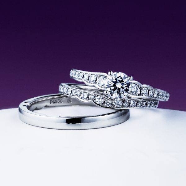 ダイヤラインが綺麗な婚約指輪は、すっきりとした上品な印象を与え、ウェーブラインが指をきれいに見せてくれます。