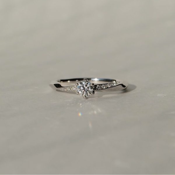 センターダイヤモンドの両サイドに小さなメレダイヤをあしらったデザインは、センターダイヤモンドを大きく見せ可愛らしく存在感があります。サイドラインのウェーブデザイン