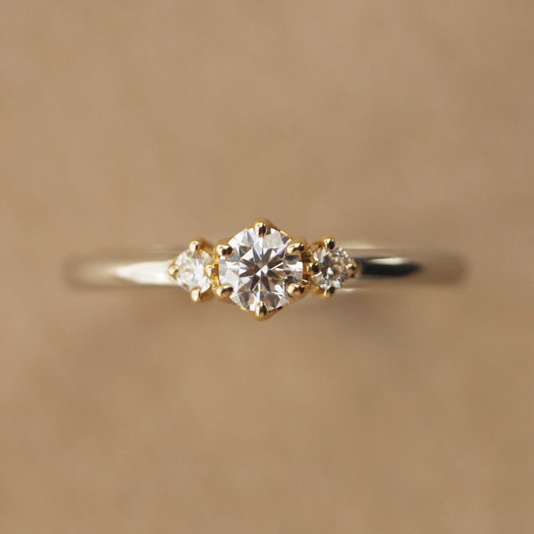 ふたりがであって、これからはじまるおふたりだけの物語を、3ピースのダイヤモンドで表現した婚約指輪。