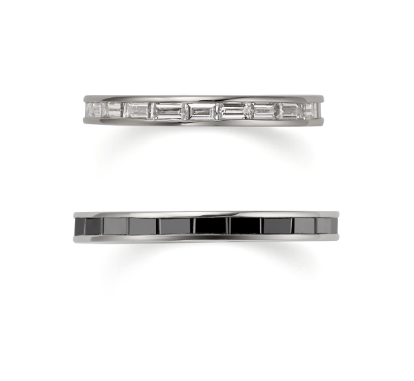 生命を感じる力強さバゲットカットダイヤが豪華に並ぶエタニティタイプの結婚指輪です。ひと目で透明な輝きの虜に。業界初!バゲットカットブラックダイヤのエタニティリングとして人気があります。深みのある輝きが魅力的なデザインは、ホワイトダイヤモンドトブラックダイヤモンドのペアとして個性を出すことができます。