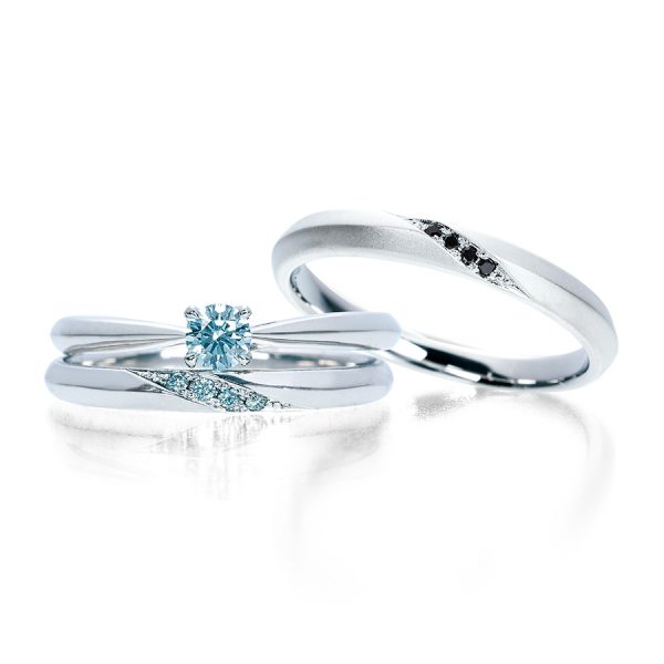メンズのブラックダイアモンドとレディースのダイアモンドがそれぞれ縦に2石並んだデザインです。ペア感がしっかりあるのも嬉しいポイント。