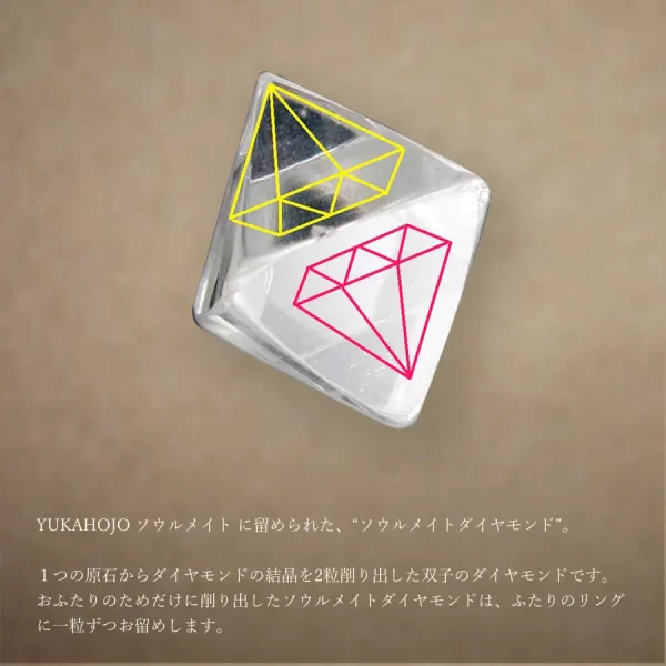 綺麗なひと粒のダイヤモンドの結晶からおふたりの為に、2粒の双子のダイヤモンドを削りだして、ひと粒ずつ二人のリングにお留めしたのがこの「Soulmates」。