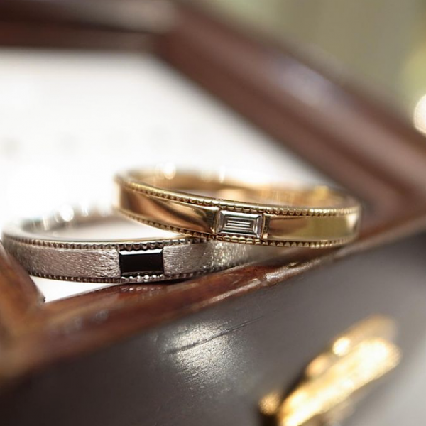 マリッジリングは、片側に施されたイエローゴールドのミル打ちが特徴的で、カジュアルにつけて頂きやすいです。メンズ、レディース共に厚みをもたせ、しっかりとしたデザインは重厚感があり、一生ものにふさわしくあります。二人のリングを重ねると、まるでたくさんの光の粒が、二人の幸せな姿を見守るようなデザインのマリッジリングです。