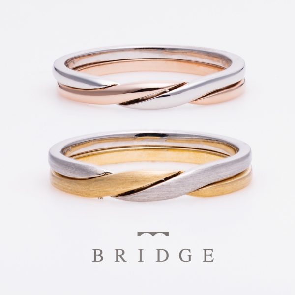 たとえば、【BRIDGE(ブリッジ)】の《結び》や《響き》は、異なるカラーゴールドをひねり合わせたようなデザイン。