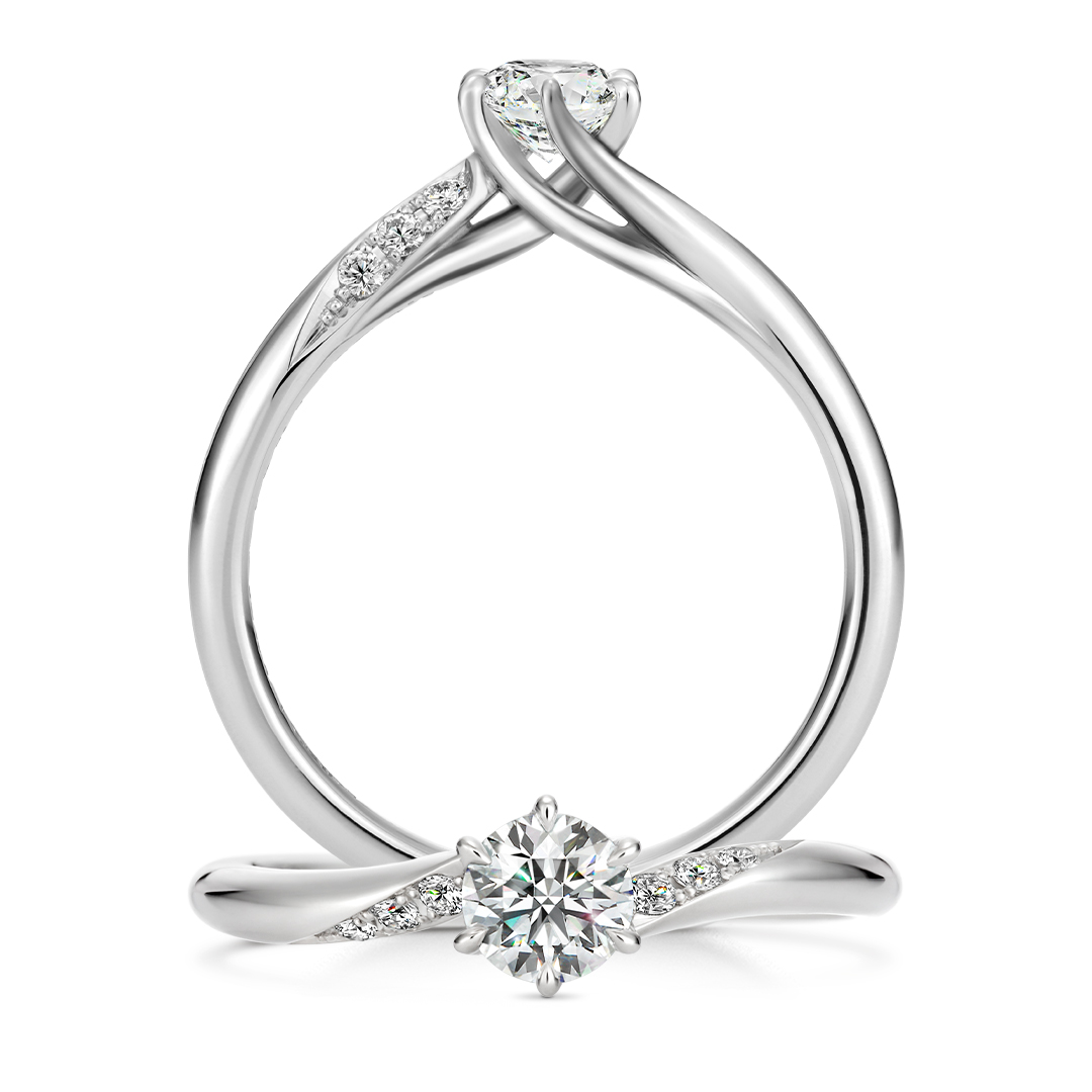 ダイヤモンドに脇石を添えた、シンプルで上品なサイドメレタイプですが、横から見ると愛らしいリボンモチーフをさりげなくデザインし、大人な雰囲気のあるデザインに。