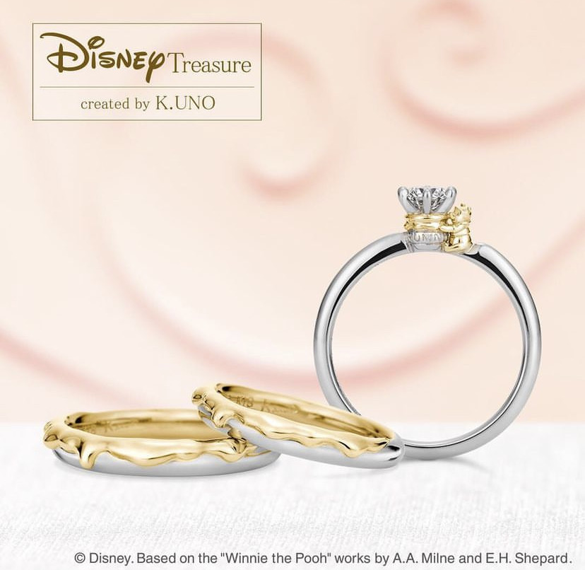プーさん好き必見!ダイヤモンドの石座が“ハニーポット”になったエンゲージリングが人気です。大好きなはちみつにぴったりとくっついているプーさんは、見ているだけで愛おしさを感じるデザインです。「愛しい人」を意味する “Sweet Honey”。身に着ける人が甘くて素敵な時間を過ごせますようにと願いをこめて。セットのマリッジリングもはちみつがとろけているようなデザインで、綺麗に重ねて身に着けることが可能。セットで身に着ければ一層、『Winnie the Pooh』の物語の世界観が楽しめます。