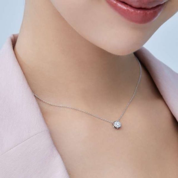 胸元に輝くダイヤモンドは上品で女性らしい印象に。シンプルな装いにも華やかさを添えてくれます。