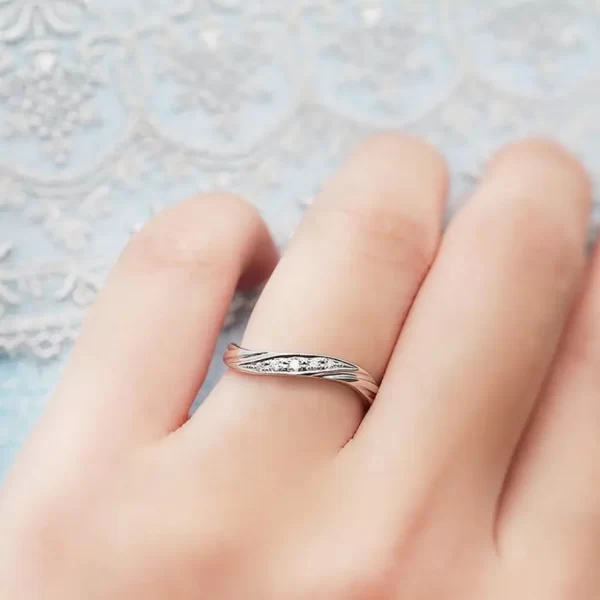 ウェーブデザインの魅力は、婚約指輪との相性の良さにもあります。カーブの形状によっては、ソリティアタイプの婚約指輪とも美しく重なり合い、自然で一体感のある重ね付けが楽しめます。特にS字やU字のようなラインは、リング同士が寄り添うようにフィットし、上品で洗練された印象に。重ね付けを考えている方には、ウェーブデザインが非常におすすめです。