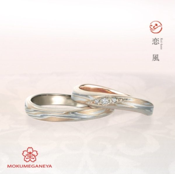 日本の伝統技法「木目金」を使った唯一無二のリングが特徴。柔らかい木目模様とウェーブラインが組み合わさることで、まるでふたりの人生を象徴するような美しさが表現されています。