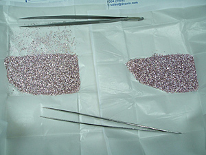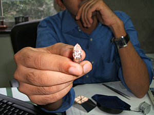(上写真)大粒のイエローダイヤモンド、(左写真)大粒!5ctUPのペアシェイプ・ピンクダイヤモンド、オーストラリア産のダイヤモンドはカラーの高品質がごろごろ産出している。