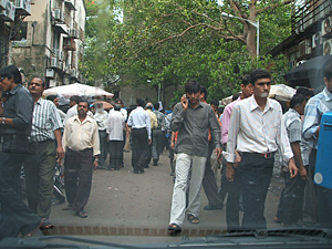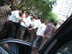 現在オペラハウス周辺には1200以上のダイヤモンド取引事務所が入っています。さらにはダイヤモンドのブローカーがインド中から集まってきていて事務所の中に居る人達曰く『何人いるか解らない位の人数』の宝石商が密集する超過密取引所です。上の写真は特に込んだ時間ではなく普通にオペラハウス敷地内をうろうろするブローカー達です。