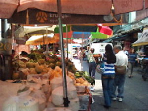 (上写真)朝のシーロム通に出ている露天商、フルーツの屋台や朝食?の屋台多彩。毎年7%台の経済成長を示しているタイ王国ですが路地を入った地元人の生活圏内に入ればまだまだ整備されきらないライフラインや生活インフラの現状が有ります。こんな風景はバンコクの街のあちこちで見る事が出来ます。