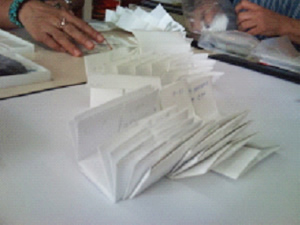 ドンドン来るよ~!業界用語で「パーセル」という宝石のくくり単位ごとに、上写真)紙の薬入れに入った宝石が「どん!」と山積みになりました、この中に運命のルビーとの出会いがあるんでしょうか?期待しながらガンガン検品していく事に、毎回ルビーやサファイアの買い付けに来ると、朝10時にこの席に座って、昼過ぎまで黙々と石の検品を続けます、目を引いた宝石は横に弾きながら次々にチェックていきます。ちなみに一回の買い付けで検品する石の数は・・・ざっと2000以上!とにかく頭の中が空っぽになるまでルビーやサファイアを見て、みて、観まくります。その際のチェック項目は様々有りますが、宝石の買い付けで一番大事なのは・・・実はパッと見の美しさなんです。※僕の場合だけかもしれません・・・(笑)