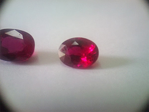 モザンビーク産ルビーの特徴としてシルク周辺に色溜まりがある事と大きなニードル・インクリュージョンそしてバブルと言われるクリスタルインクリュージョンが有る事が特徴のようです、実際に拡大鏡で観察すると、確かにそれらしいものが見えてきました、その後いくつものモザンビーク産ルビーをチェックしていくと何となく、シルク周辺の色溜りや大きなニードル状インクリューションが掴めてきました、ルビーにとって命ともいえる色の印象を決める紫外線反応もミャンマー産ルビーよりはやや弱め、ただこれに関しては決め手となるほどの差はないように思えました。第一印象では相当ルビーに詳しい宝石屋さんなら「ミャンマー産に比べて何か大味な感じがする・・・?」と思う程度のわずかな違和感しか感じないのでは?と思います。