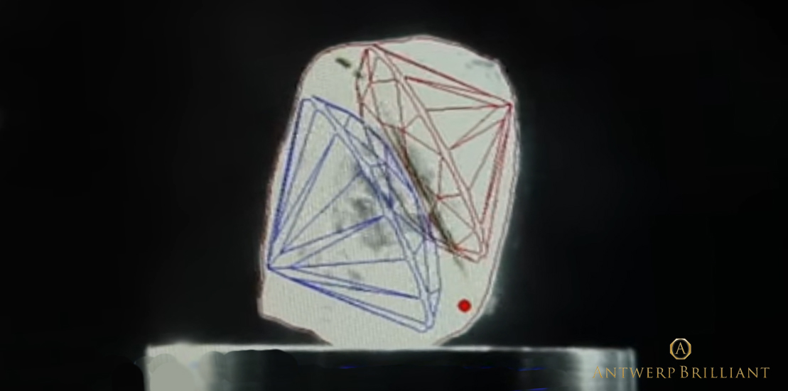 レーザーソーイング技術が確立されるまではグリーピングしてダイヤモンドを”割る(カットする)”しか加工の手立ては在りませんでしたが、現在はレーザースキャニングをしてカットプランを立案すると、その通りにレーザーソーイングする事が出来ます。