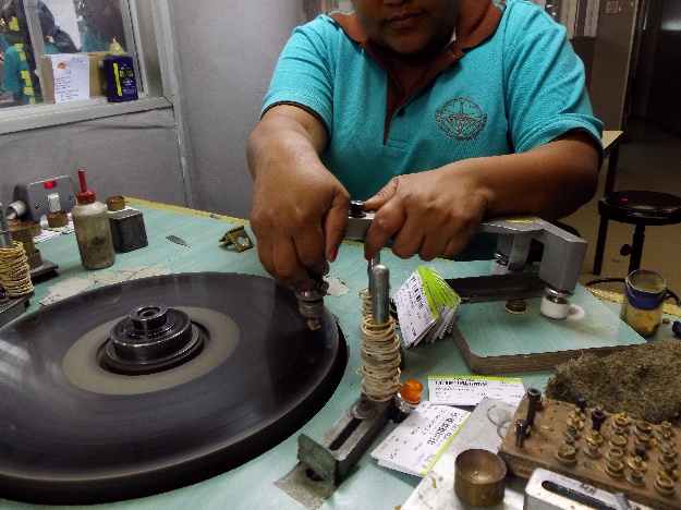 最初は原石を旋盤状のダイヤモンドを固定する器具(ドープ)にセットし、もう一つの研磨用ダイヤモンドをセットした工具に押し当てて高速で回転させ、テーブルを正面に見たダイヤモンドの外周を丸く曲線状に仕上げていました。ダイヤモンドのガードル部分を仕上げると言う意味でガードリングとも言われます。 当時は人力ペダルが動力源でしたので気の遠くなるような作業だったと思われます。