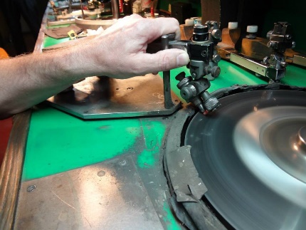 円盤状のソーイング・ブレードにペースト状の研磨剤を塗布し固定したダイヤモンドを押し当てると少しずつ研磨できます。この際研磨する石自体から出るダイヤモンドの粉末がソーイング・ブレードに絶えず装着される画期的な仕組みでした。